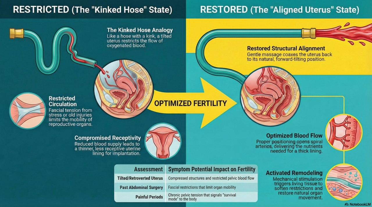 Abdominal massage for fertility works by improving blood flow to the uterus and ovaries, releasing fascial restrictions that limit organ mobility, gently repositioning the uterus when structural alignment is needed, supporting lymphatic drainage, and calming the nervous system so your body can shift out of survival mode and into the conditions where conception becomes possible. It is both mechanical and physiological, grounded in anatomy, and it works best when performed by a certified practitioner who understands the full picture of your reproductive health. Prefer to listen instead? You already know what you’re hoping for. You don’t need anyone to describe it. The positive test. The way you’d tell your husband. The way your older kids would react. You carry that picture with you, and it is the reason you keep asking questions, keep researching, keep trying. So let’s start there. With where you’re going, not where you’ve been. Most women who come to see me have spent months, sometimes longer, asking some version of the same question: “What is wrong with me?” They’ve tracked their cycles. They’ve taken the supplements. They’ve read the books and followed the advice and done everything the right way. And they are exhausted from trying so hard and still not having answers that feel real. Here is what I want you to consider. What if the better question isn’t “what’s wrong with me?” but “what does my body need that it isn’t getting right now?” That one shift changes everything. For many women, the answer turns out to be surprisingly physical. Not emotional. Not mysterious. Structural. Circulatory. Mechanical. And that is where abdominal massage enters the conversation, not as a last resort or a long shot, but as a legitimate physiological tool with deep roots in traditional medicine and a clear anatomical explanation for why it works. Why Your Uterus Position Matters More Than Anyone Told You Most women have never been told that their uterus has a position, that it can shift from that position, and that when it does, the entire environment for conception changes with it. Think about a garden hose lying in your backyard on a summer afternoon. The water is there. The pressure is there. But if someone steps on that hose, or it bends around a corner too sharply, the water slows to a trickle. It can’t reach the garden no matter how much pressure is behind it. Your uterus, ovaries, and fallopian tubes need a steady, rich flow of oxygenated blood to do their jobs. When your uterus is tilted forward, backward, or to one side, which is far more common than most women know, or when the connective tissue surrounding it has tightened from past surgeries, old injuries, previous pregnancies, or even years of sitting in the same position, that flow gets restricted. Not cut off completely. Just kinked. And a kinked hose doesn’t grow much of anything. Research published through the National Institutes of Health has consistently shown that adequate uterine blood flow is one of the foundational requirements for successful implantation and early pregnancy. This isn’t alternative medicine. This is anatomy. Abdominal massage, performed by someone with real training in soft tissue work and reproductive anatomy, gently coaxes those structures back toward optimal position. It releases the restrictions. It restores circulation. It helps your body do what it already knows how to do. Your body was designed for this. Sometimes it just needs someone who understands the design. What Abdominal Massage for Fertility Actually Does Inside Your Body Here is the physiology, explained the way I explain it to my students at Lansing Community College and to the women who sit across from me in my Grand Ledge office. No jargon. Just the real mechanics. 1. Restores Uterine Blood Flow When your uterus is properly positioned and the surrounding fascia is relaxed, oxygenated blood flows freely to your uterine lining, your ovaries, and your fallopian tubes. A well-nourished uterine lining is thicker, more receptive, and better prepared to support implantation. When blood flow is compromised, conditions are compromised. Gentle abdominal massage physically opens those pathways by reducing tension in the surrounding soft tissue and encouraging fresh circulation into an area that may have been partially starved of it. Professor’s Note: In my physiology courses, I teach students that endometrial receptivity, meaning how well the uterine lining accepts a fertilized egg, depends directly on the density and quality of spiral arteries within that lining. Those arteries only develop well when blood supply to the uterus is consistent and adequate. This is not a theory. It is observable histology. 2. Releases Fascial Restrictions Fascia is the connective tissue that surrounds and supports every organ in your body, holding each one in its proper place while allowing the gentle movement your organs need to function. It is also the tissue that tightens in response to stress, surgery, infection, and old injury. Women who have had a C-section, an endometriosis diagnosis, or even significant emotional stress often carry fascial tension in their pelvic bowl that quietly limits organ mobility without causing obvious pain. Skilled abdominal massage works directly with this tissue, softening restrictions and restoring the natural movement your reproductive organs need to function at their best. You can read more about how structural care supports women’s health on our Natural Fertility Enhancement Services page. Professor’s Note: Fascia is not passive packaging. It is a living tissue densely populated with fibroblasts, the cells responsible for producing and remodeling connective tissue throughout your life. Research on fascial biology shows that mechanical stimulation, meaning skilled hands-on pressure, directly activates fibroblast remodeling. That is the cellular reason why massage produces lasting structural